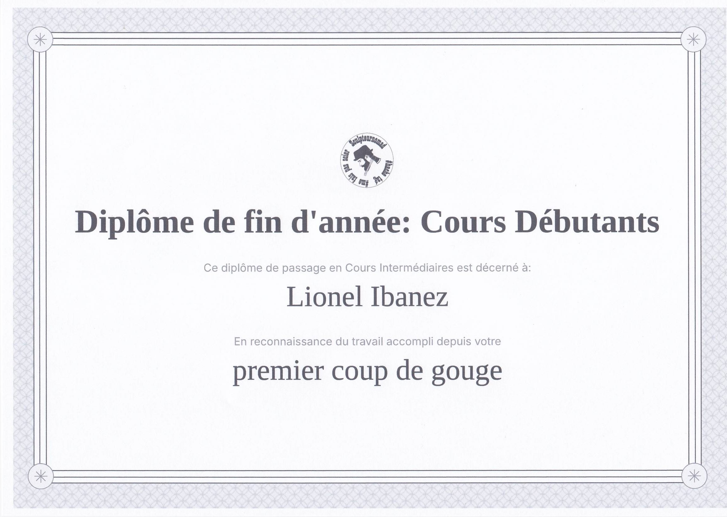 C'est avec une grande fierté que je te remettrais ton diplôme de fin d'année; Niveau Débutant, qui vient couronner tous les progrès accomplis depuis ton tout premier coup de gouge. Chaque leçon, chaque exercice, chaque heure passée à perfectionner ton geste t'as conduit jusqu'ici, et cela mérite d'être reconnu à sa juste valeur.