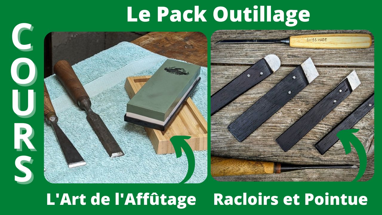 Pour progresser en sculpture sur bois, de bons outils sont essentiels. Mais le plus important: Savoir les entretenir et les affûter pour maintenir un tranchant parfait. Vous obtiendrez ainsi une coupe facile, fluide et sans forcer. Dans ces 2 formations, je vous apprends ces techniques d'affûtage, mais aussi à fabriquer vos propres racloirs, et votre pointue, des outils uniques qu'on ne trouve pas dans le commerce.